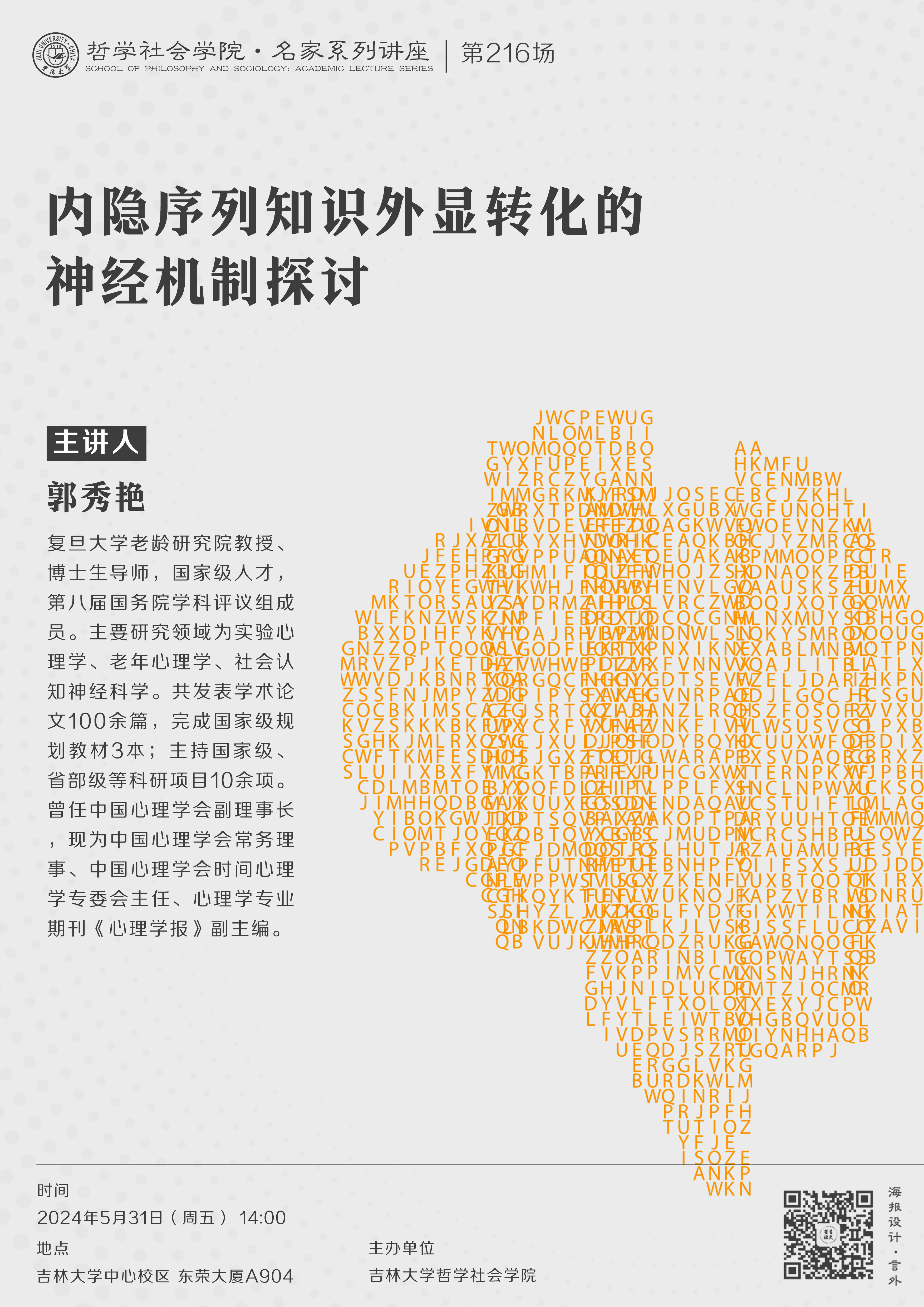 2024年5月31日,365英国上市集团名家系列讲座第216场于吉大中心校区东荣大厦904举办。讲座由复旦大学老龄研究院教授郭秀艳主讲,题目为“内隐序列知识外显转化的神经机制探讨”。365英国上市集团心理学系张彦彦教授主持,金庆英副教授、高玉林副教授、刘博副教授等四十余位来自哲学和心理学系的教师和员工参加了本次讲座。