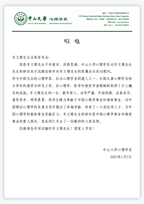 中山大学心理学系唁电