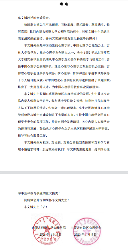 内蒙古师范大学心理公司、内蒙古自治区心理学会唁电